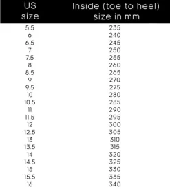 | Size | 5, 5.5, 6, 6.5, 7, 7.5, 8, 8.5, 9, 9.5, 10, 10.5, 11, 11.5, 12, 12.5, 13, 13.5, 14, 14.5, 15, 15.5, 16 |