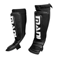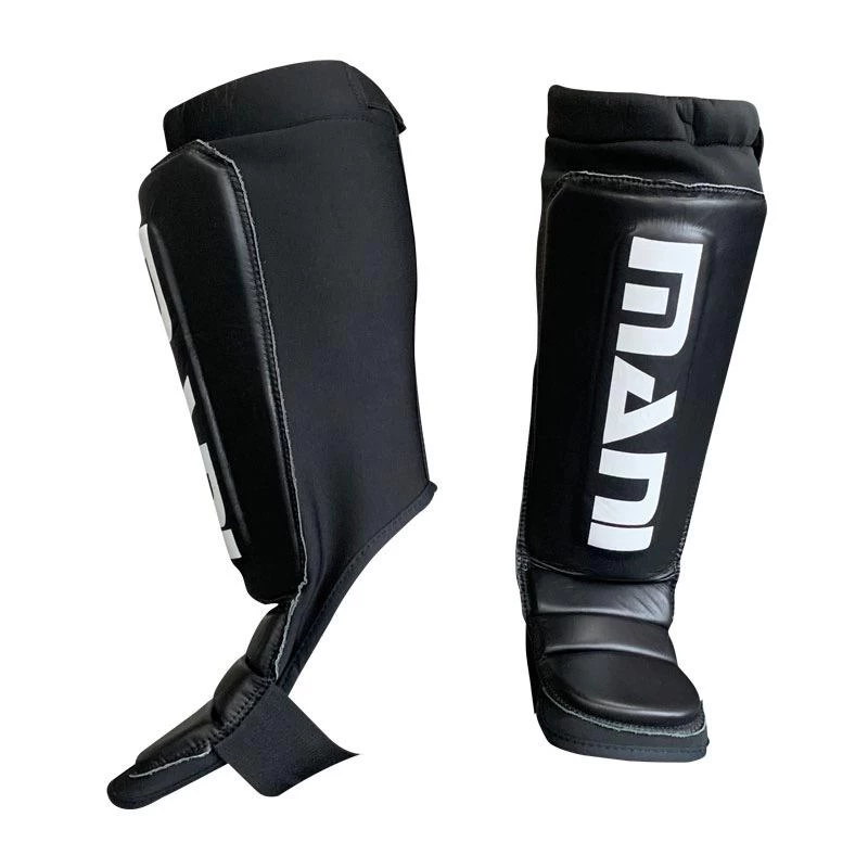 Neoprene shin and step pads, with front face leather designed for power kicking and blows. Lightweight and durable to provide complete protection for both the shin and instep.