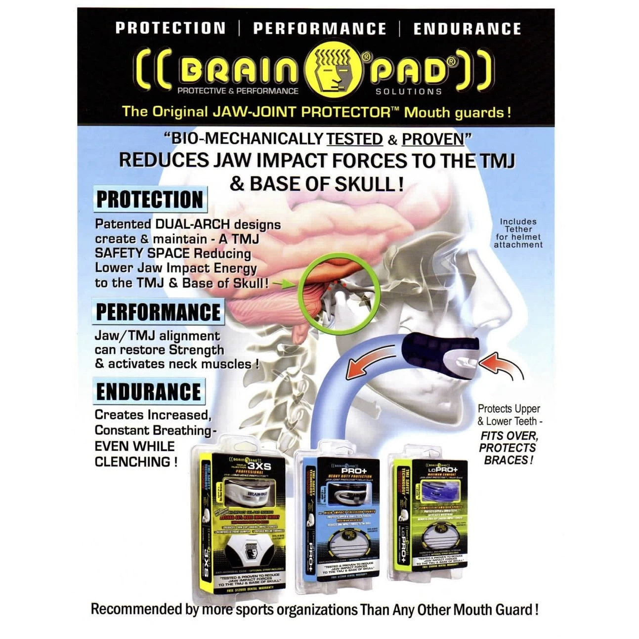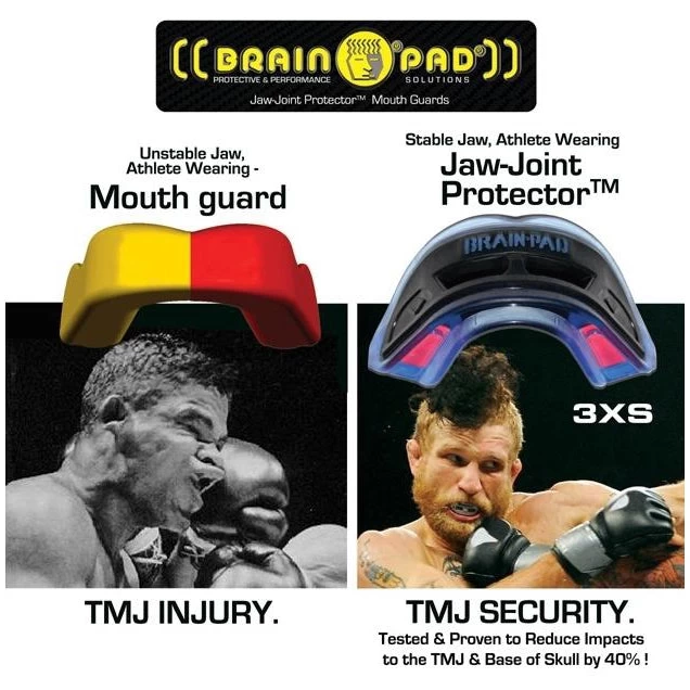 The Brain-Pad 3XS mouth guard is a Tri-Thermoplastic Protective & Performance dual arched mouth guard. Brain-Pad’s advanced high-impact gel cube inserts offer a whole new level of lower jaw deceleration and impact absorption. The tapered channel ends replace the need for trimming for desired comfort and custom fit. Augmented front wrap-around bumper along channel sides increases later jaw stability and protection. A new larger, ventilated, and snap-tight case with large handle manufactured with antimicrobial materials deprive germs an environment to thrive. Includes strap for multi-sport use. High Impact gel pad inserts Gel form liner molds firmly to teeth, supporting the entire arch Airflow clench and breath technology enhance breathing. 30-second custom fitting Latex Free The preferred mouth guard for high level contact sports