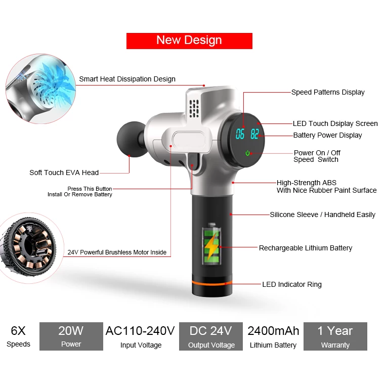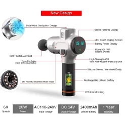 MORGAN COMMERCIAL MASSAGE GUN The Morgan Massage Gun has a slick ergonomic design that can be comfortably held at a variety of angles allowing for both a therapist to press into otherwise awkward spots or for athletes to use the massage gun on themselves. The ergonomic silicone handles grips well even without the use of a mould so the gun can be rotated freely. There are six (6) different speeds that allow for intensity to be customised to you or your patient’s ideal level. A common complaint among inferior models is that the excessive noise generated is distracting or annoying. With the Morgan Massage Gun, a quiet conversation can be comfortably heard even at the highest intensity; the noise is comparable to clippers when having a haircut. The Massage Gun is the pinnacle in its emerging field of therapeutic vibrating technology. Quieter, more comfortable and with more range than its competitors, the Massage Gun is recommended for health professionals and for elite athletes who will not accept anything less than the best. Upgrade LCD touch screen for smarter and easier operation Features: Including 4 different massage head, meeting various demand. The maximum speed can reach 4200r/min, which is higher than other similar products Effectively reduce muscle stiffness and sore pain, increasing blood circulation 1-6 speed adjustment, you can choose that you fit 10 minutes intelligent timing guarantees a long life of the machine Super large capacity lithium battery, 2-3 hours work time With over-protection, overheat protection and other safety protection devices, safe to use Suitable for recovery after sports fatigue, rehabilitation after a sports injury, pain relief during the convalescence period of surgery, as well as reducing inflammatory reaction Specifications: Power Charger – Rated input: 100~240V 50/70Hz 1A Battery – Rated Voltage: 24V DC – Type: Li-ion – Capacity: 2400mAh – Maximum speed: 4200r/min Power output: 20W Noise output: 40db +/- 5% Weight: 1.09kg Dimension: 25 x 23cm Package Included: 1 x Massage Gun, 4 x Massage Tips, 1 x Li-ion Battery, 1 x Power Charger, 1 x Product Manual, 1 x Box, 1 x direct Australian power adaptor