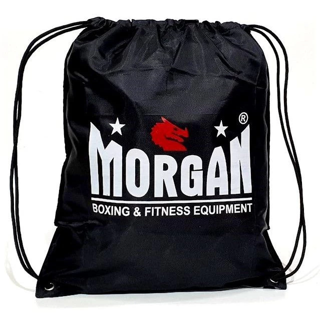MORGAN DRAWSTRING GYM SACK The Morgan drawstring backpack will help you keep your essential work and training gear close. Made using highly durable polyester fabric and easy to pull drawstring cord that doubles-up as shoulder straps make this an essential on-the-go gym sack. Our gym sack can fit boxing gloves, focus pads, weight lifting and MMA training essential as well as wet towels, clean clothes and just about anything else required when training. Made from polyester Easy to pull draw string that doubles as shoulder straps Water resistant Easy to keep clean Measuring: 41cm long and 36cm wide