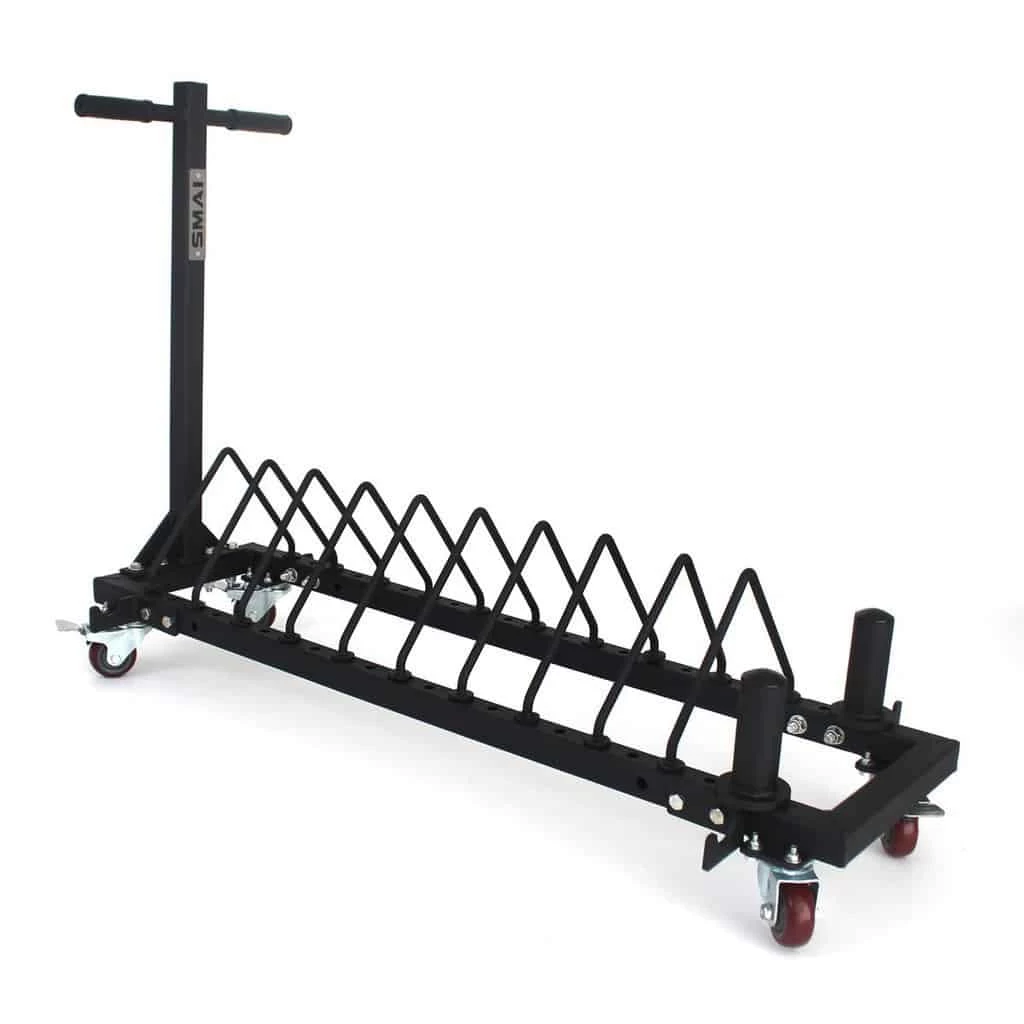 The SMAI Bumper Plate Trolley Hybrid is the ultimate in weight plate storage. The rack has commercial grade wheels on the base that allow a free pivoting motion with a lockable option. Featuring adjustable dividers, the SMAI trolley can accommodate standard bumper plates along with the traditional Elite bumpers making it a functional storage solution. With other key features such as the storage of fractional plates or collars at the front as well as the addition of space for two barbells on the sides, the SMAI trolley is a perfect addition to any commercial space.
