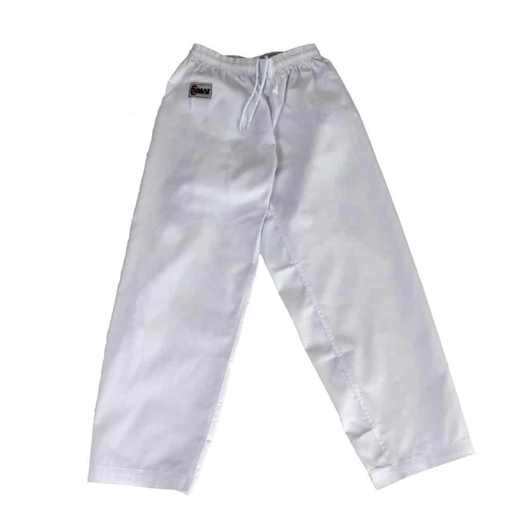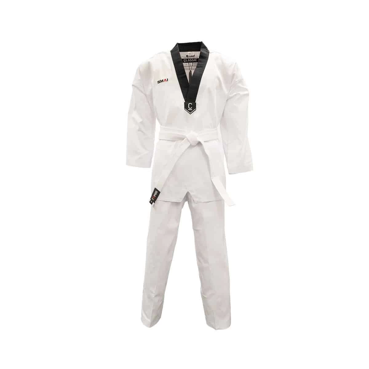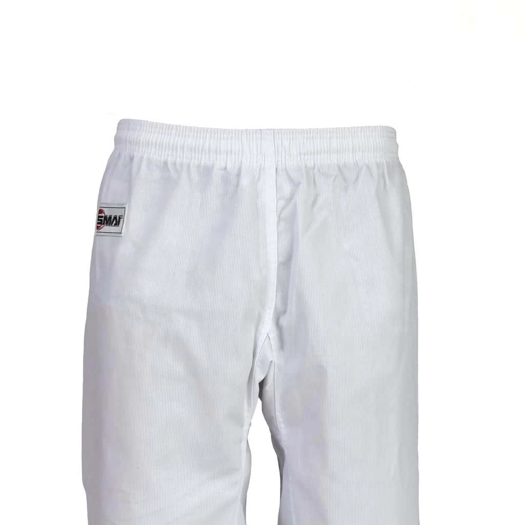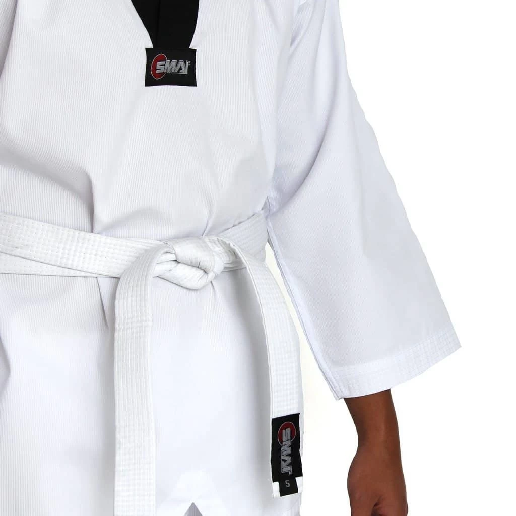The SMAI Martial Arts Taekwondo Uniform Ribbed uniform is a lightweight Taekwondo Dobok suitable for club and competition use. Made from 35% cotton and 65% polyester blend ribbed fabric it offers top quality strength and durability. SMAI has created a special fighters size chart for the Dobok trousers with a full gusset innovation. This ensures that the trousers give you the freedom you need for fast, effective kicking with minimal resistance.